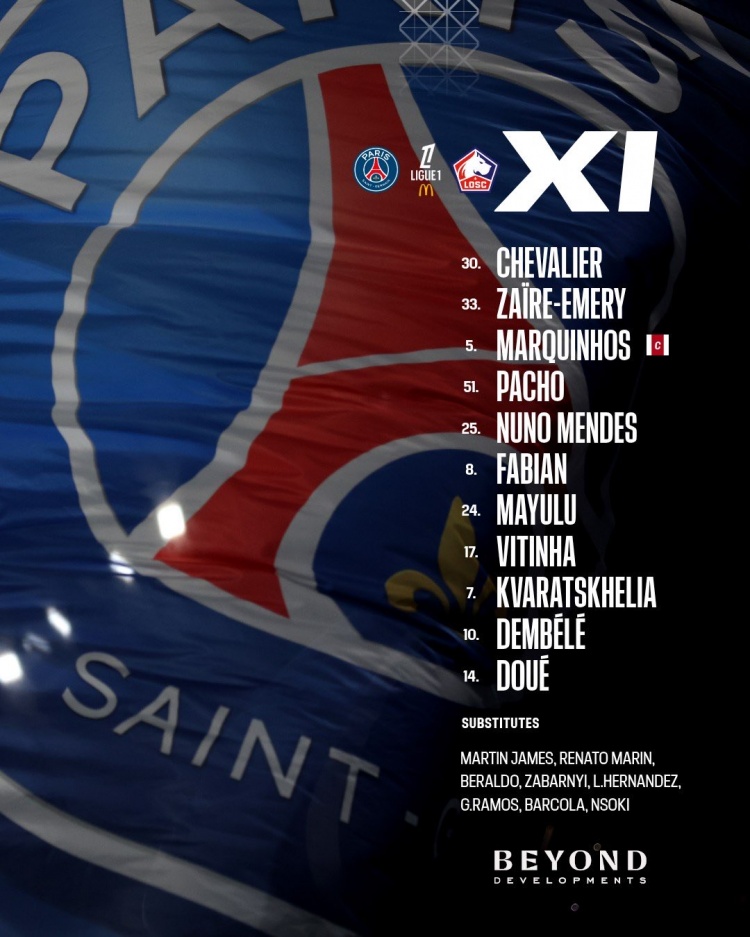 30-舍瓦利耶、33-扎伊尔·埃梅里、5-马尔基尼奥斯、51-帕乔、25-努诺·门德斯、8-法比安·鲁伊斯、24-马尤卢、17-维蒂尼亚、7-克瓦拉茨赫利亚、10-登贝莱、14-杜埃