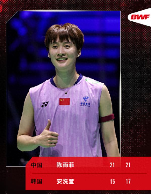 2025年羽毛球世锦赛女单半决赛,陈雨菲2-0击败安洗莹晋级决赛,两局比分:21-15、21-17。陈雨菲第二次进入世锦赛女单决赛,而卫冕冠军安洗莹将无缘冲击二连冠。