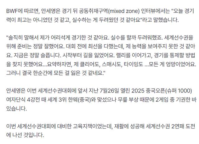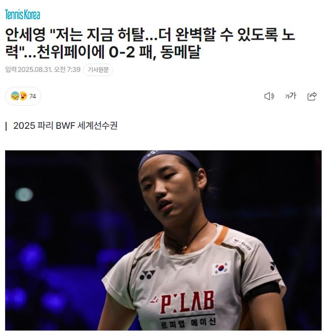 韩媒《Tennis Korea》写道:羽毛球女王安洗莹被陈雨菲横扫无缘卫冕,世界排名第一的选手被世界排名第四的选手横扫了。安洗莹作为2023年哥本哈根世锦赛冠军未能进入决赛这是完全无法接受的“令人震惊”的失败。