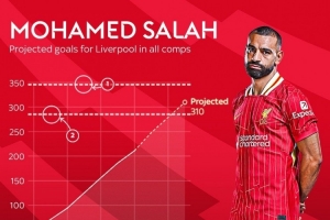 天空体育根据萨拉赫的进球效率推算,如果他能够履行完这份新合同,并保持进球效率,最终可以为利物浦打进310球,升至队史射手榜第二位。
